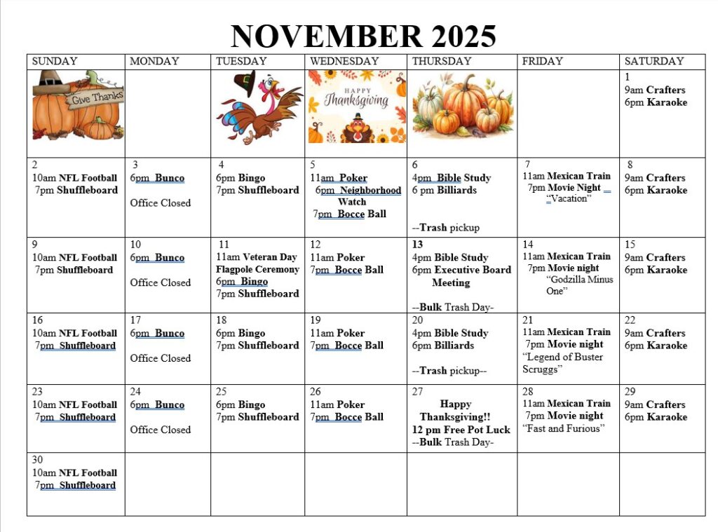 *** NO FOOTBALL OR SPORTING EVENTS DURING THE FOLLOWING EVENTS DURING EVENTS: MOVIE NIGHTS/CRAFT CLUB/KARAOKE/BUNCO/BINGO ***