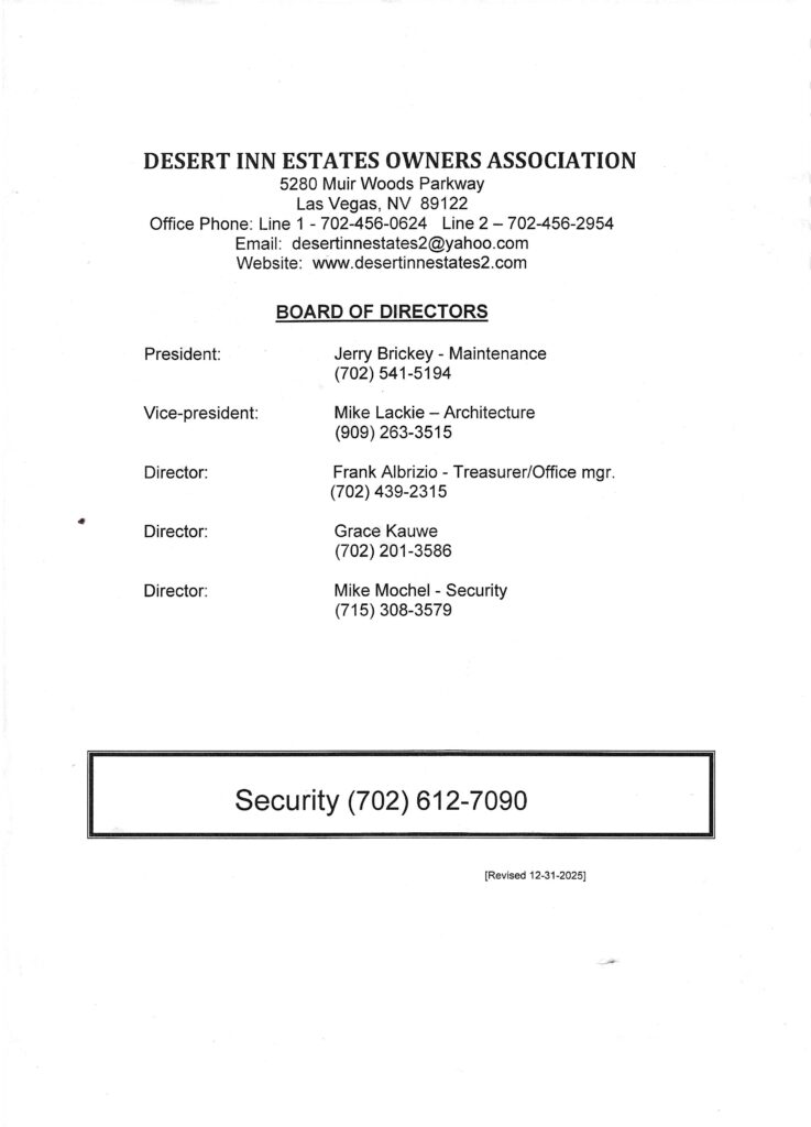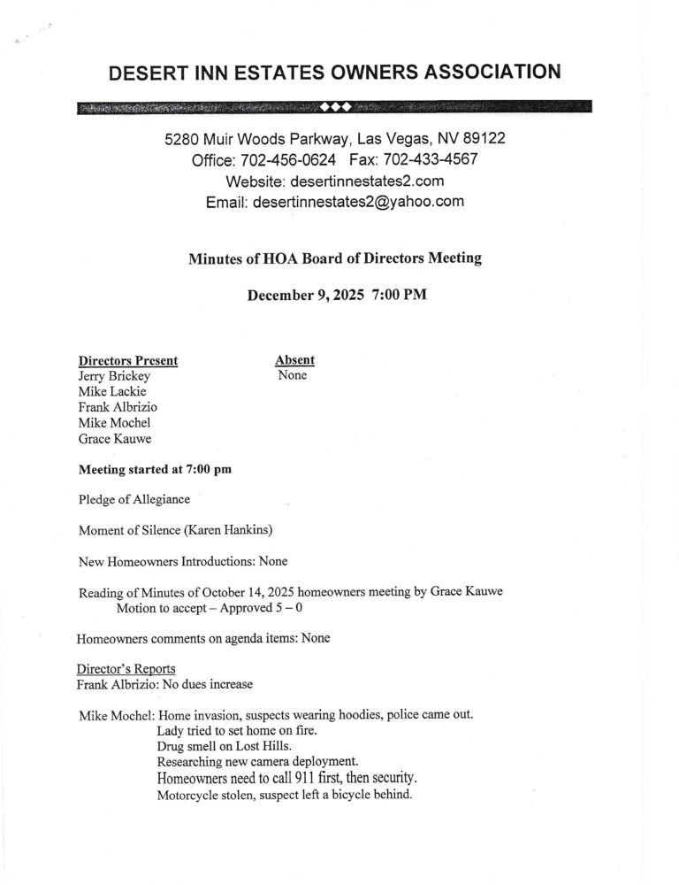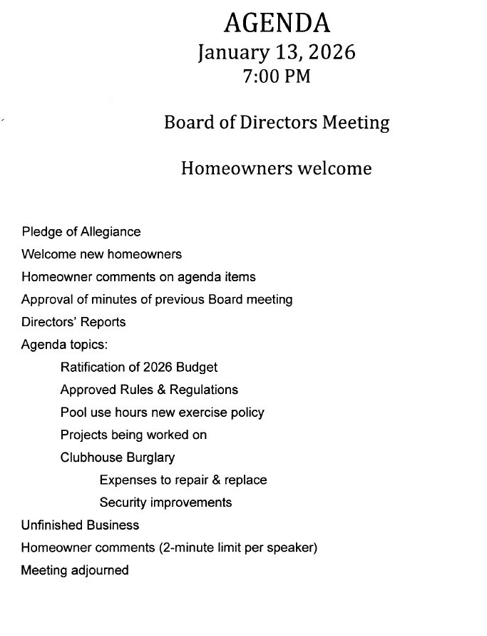 MONTHLY MEETINGS 2026 UPCOMING BOARD OF DIRECTORS MEETINGS TUESDAY, JANUARY 13, 2026 -7:00 PM BOARD OF DIRECTOR MEETING NEIGHBORHOOD WATCH*** YOU ARE NEIGHBORHOOD WATCH!!! ***EVERY 1st WEDNESDAY OF THE MONTHALL HOMEOWNERS ARE INVITED TO ATTEND*** NEXT MEETING: JANUARY 07, 2025 6:00 PM *** ALL ARE INVITED COME TO THE CLUBHOUSE TO DISCUSS IDEAS AND UPDATES ON SAFETY AND SECURITY ISSUES.-SNACKS & COFFEE ARE USUALLY PROVIDED, BUT FEEL FREE TO CONTRIBUTE ANY SNACKS OF YOUR CHOOSING–HOSTED BY LOIS LACKIE Announcements Monthly Meetings Social & Recreation (S&R) & Special Events Monthly/Weekly Events & Activities Third Party Events Neighborhood Watch Amenities Documents Announcements Monthly Meetings Social & Recreation (S&R) & Special Events Monthly/Weekly Events & Activities Third Party Events Neighborhood Watch Amenities Documents